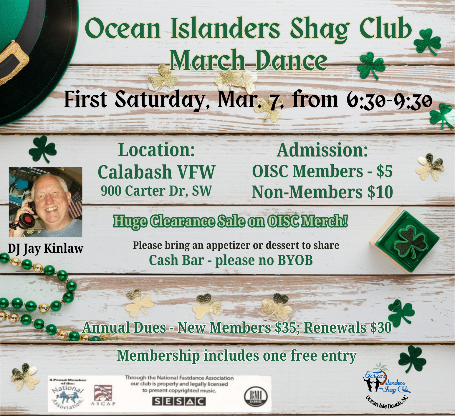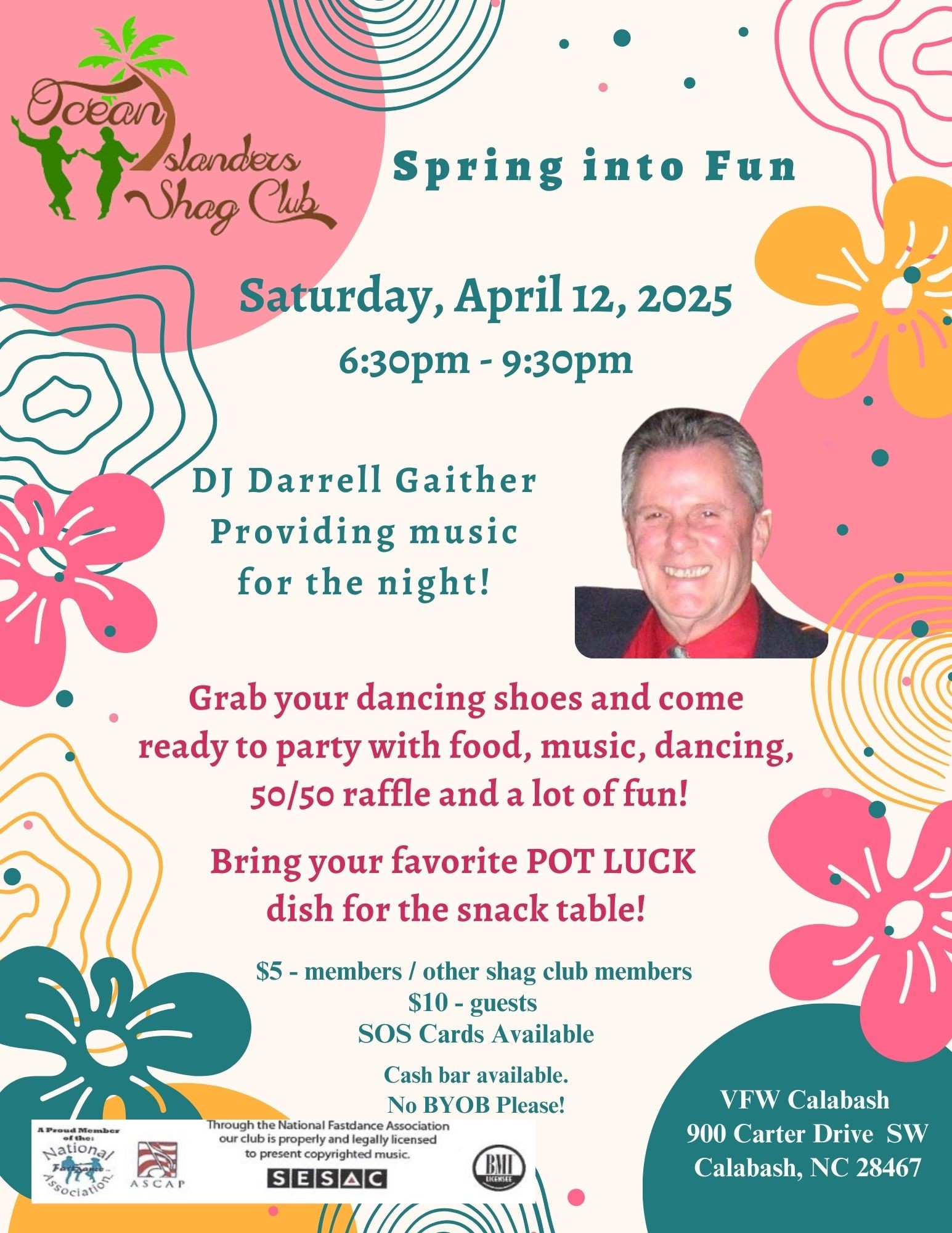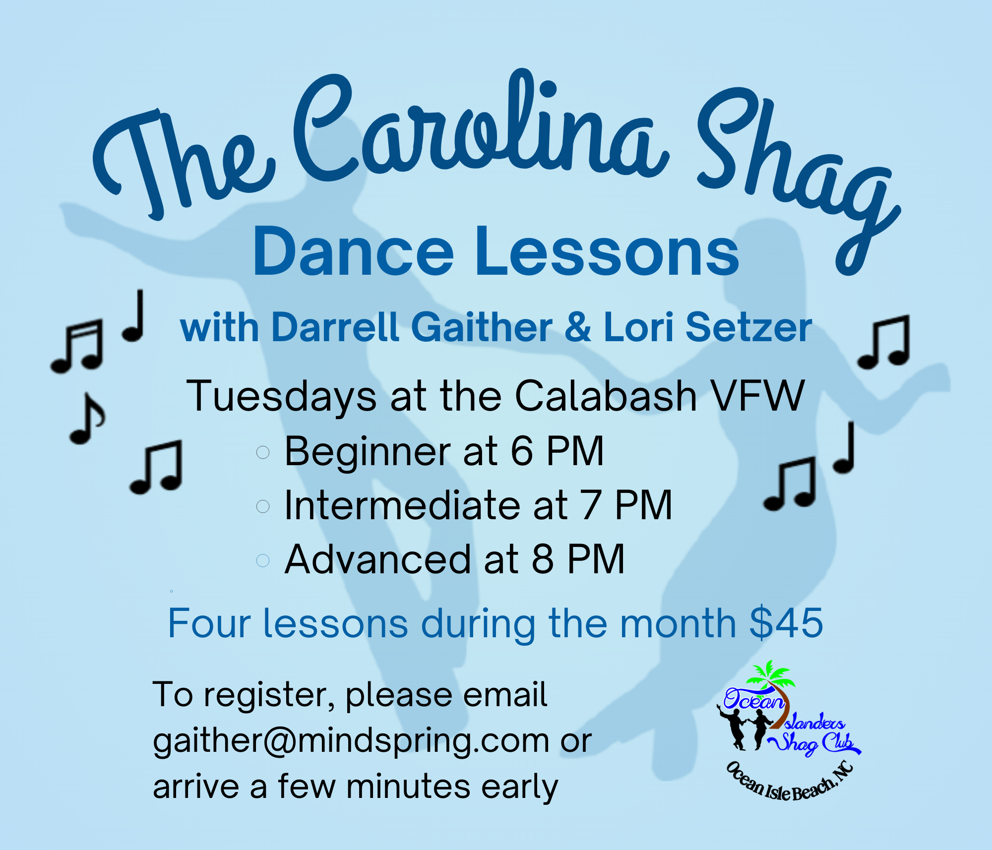 We hold dances on the 2nd Saturday of every month from 6:30-10pm at the VFW (900 Carter Drive SW, Calabash, NC)